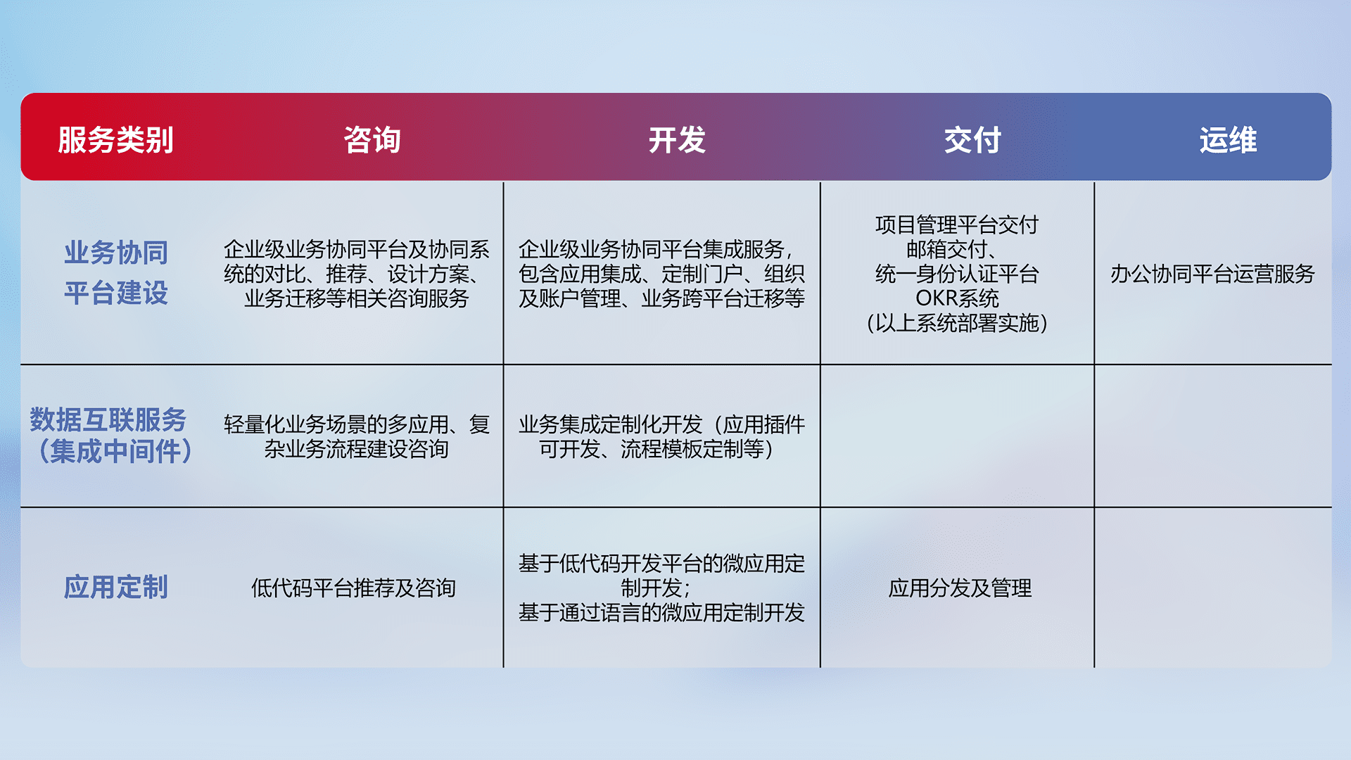针对钉钉、、、、企微、、IDaas等平台级产品提供产品的规划、、、方案、、、、交付、、、定制化开发等服务,,,,实现如统一协同办公、、、、智能客户服务、、混合会议管理、、智能数据查询、、等业务场景,,实现数字化转型。。